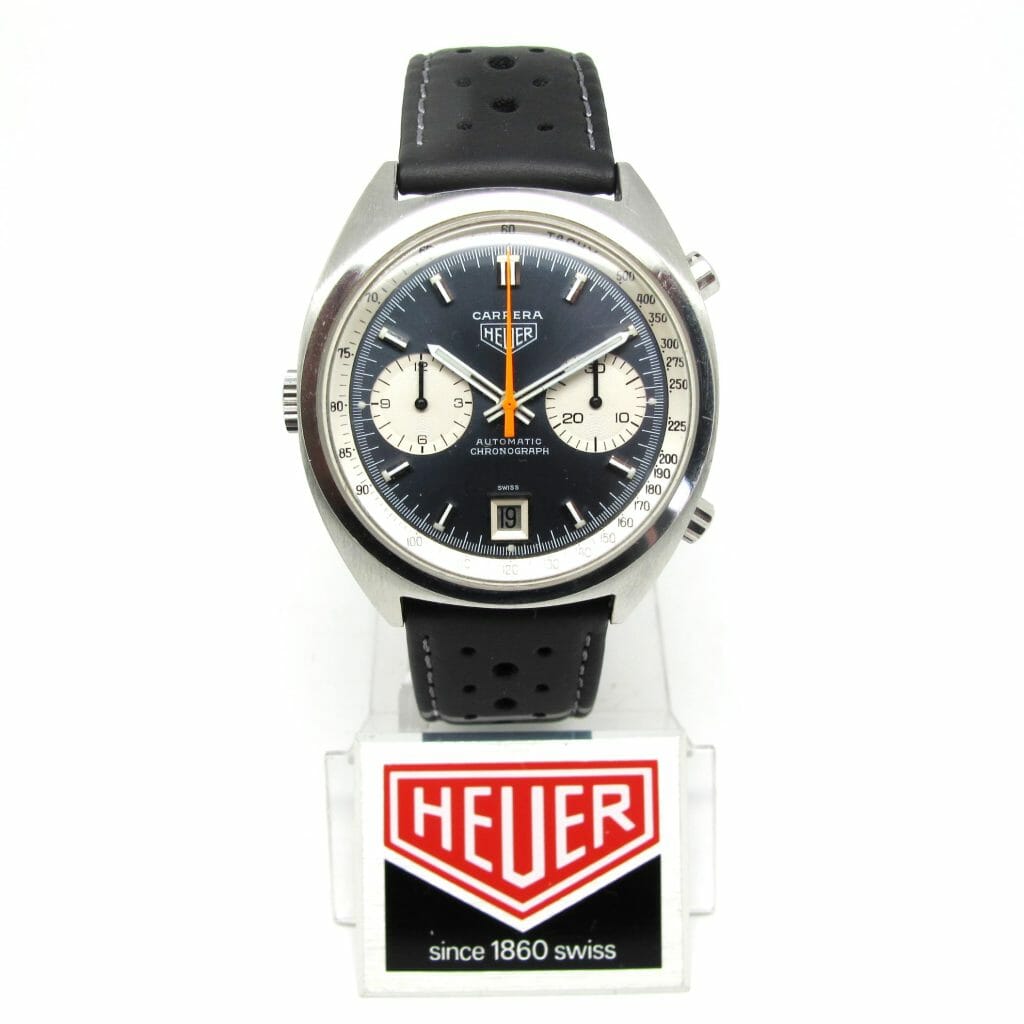 An amazing find from the original owner, 1153b which is now sometimes referred to as the “Jagger” as photographs have emerged of Mick Jagger wearing the exact reference circa 1972/3 , iconic blue dial with contrasting white sub dials and tachy ring. The watch is so original from the first owner, box, guarantee, bill of sale and records of 3 services from Heuer, Duval (Heuer UK) and later Tag Heuer. So rare to find one this complete hence the premium.