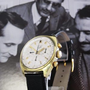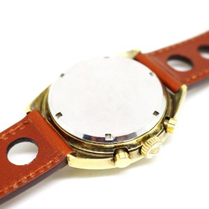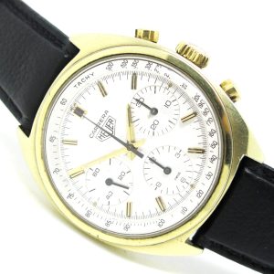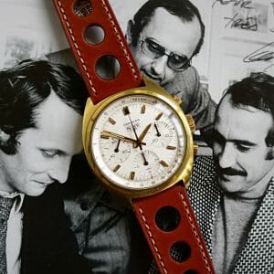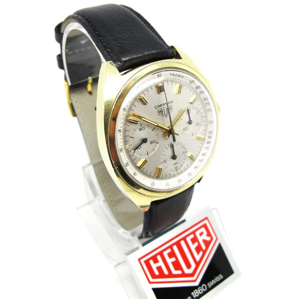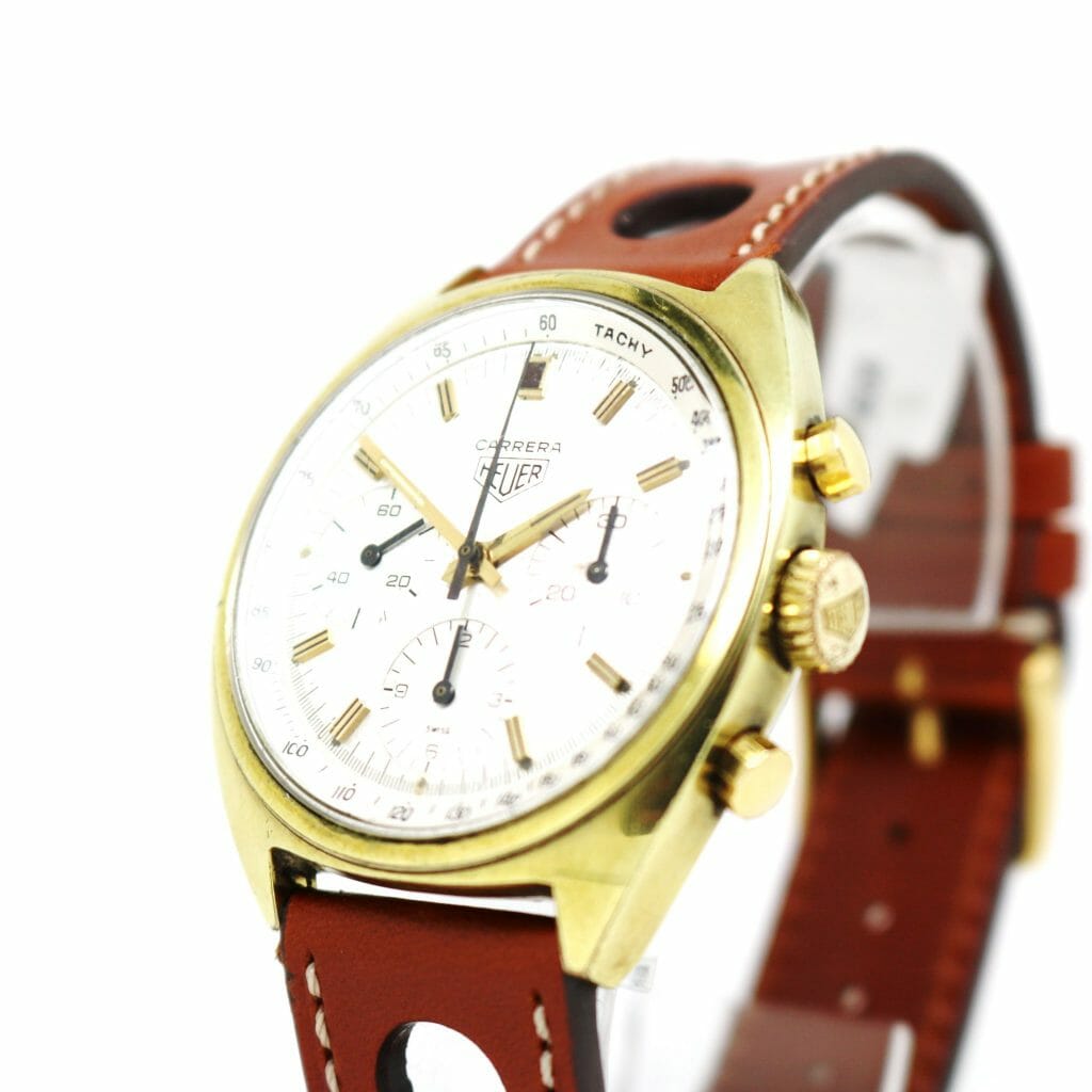 This superb gold plated manual wind Carrera 73655 is an important piece of Heuer history; originally manufactured in accordance to the line of solid gold Carreras deployed to Ferrari drivers as part of Heuer’s cooperation between 1971 and 1979 with the esteemed racing brand. As a watch with such historical significance, this watch presents great value for money. Furthermore the watch is powered by a manual wind valjoux 7736 movement. Contrasting from the luscious gold plated case is a brushed silver plated dial with gilt hands and GP applied batons. All aspects of this watch are original including the signed Heuer crown. The solid gold versions have moved up in price so strongly, allowing for this beautiful piece to be collected at good price yet looking equally as superb on the wrist.