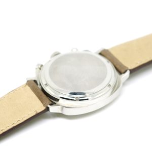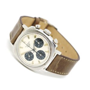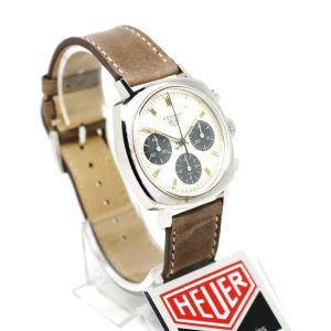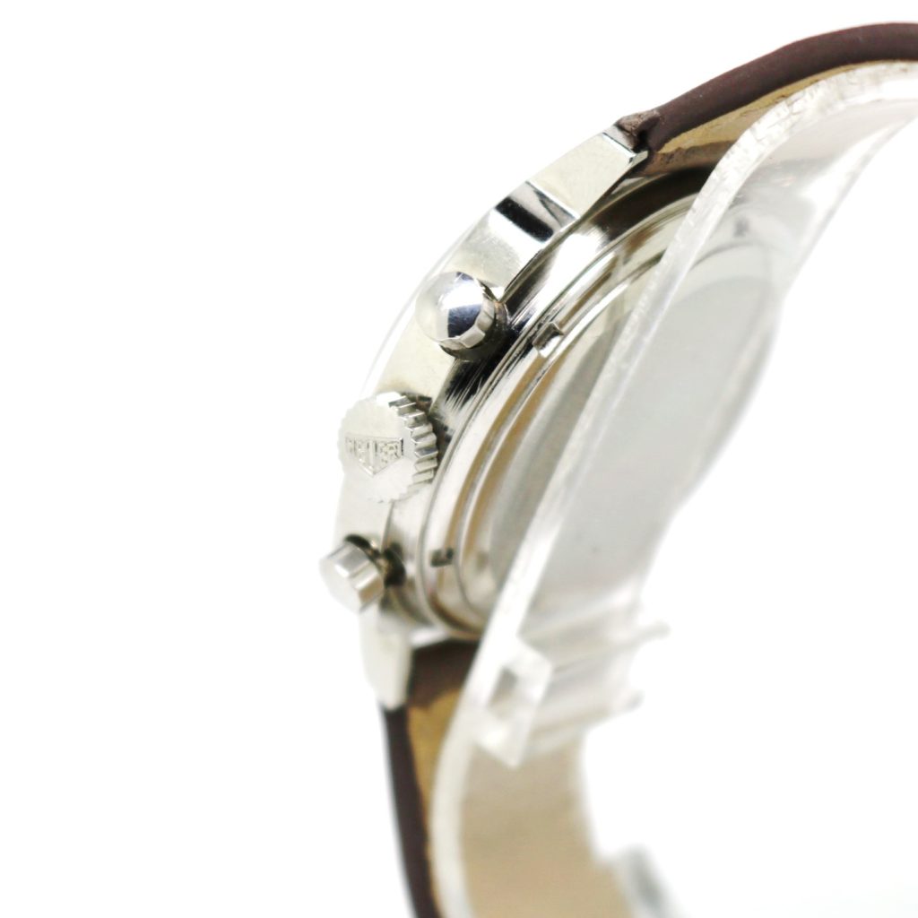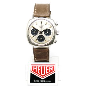 Heuer Camaro 7220SN with its three registers is perhaps the most sought after of all the Camaro models. Powered by the hand-wound Valujoux 72 movement, this superb example is complete with an unpolished case with contrasting sunburst finish and clear edges. The dial has all the original lume spots in tact.