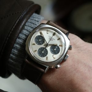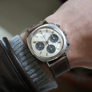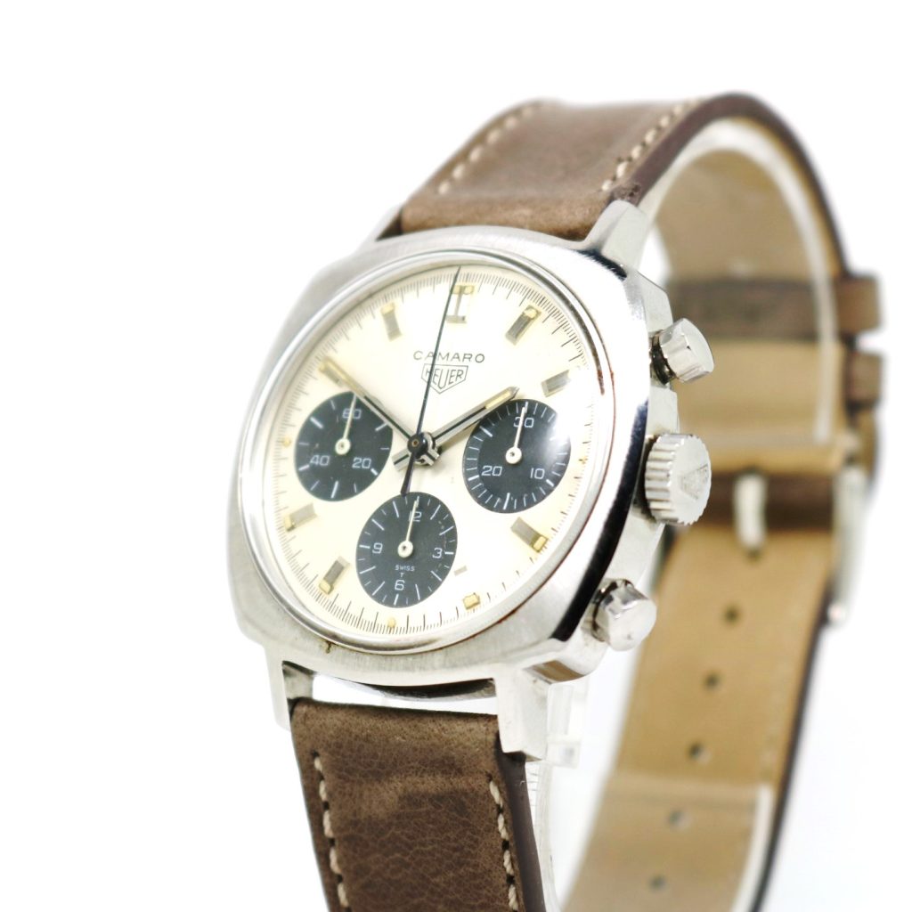 In the shadow of such giants as the Monaco, Carrera and Autavia, the Heuer Camaro’s innovative spirit remains largely overlooked. However as prices for Heuer’s famed trio continue to soar, the Camaro is witnessing a quiet renaissance as the brand’s best value in vintage. Produced in the late ‘60s golden era of legendary sports watches, the early three register Camaro shares its Valjoux 72 movement with the likes of Rolex’s Daytona and the pre-806 Breitling Navitimer. For the serious collector, the Camaro checks all boxes by merit of its specifications alone. Yet for the modern enthusiast, this watch offers a contemporary flare that many vintage pieces do not. Criticisms of the Carrera arise through its modest 36mm diameter- while only 1mm larger, the Camaro’s square shape commands a greater, fleshed out presence on the wrist. Sharing similar dials, hands and movements, the Camaro had all the simplicity of its predecessor, the Carrera. However the Camaro’s major difference lies in its cushion-shaped case, boasting a polished grind on its concave sides to offer a grittier modern character. Much as the Camaro automobile was Chevrolet’s response to the wildly popular Ford Mustang, the Heuer Camaro offered a dynamic new spin on its elder sister. However, while the Chevy Camaro’s star would continue to rise, the Camaro wristwatch would be discontinued after only 4 years in 1972, eclipsed by Heuer’s bold new line of automatic chronographs.