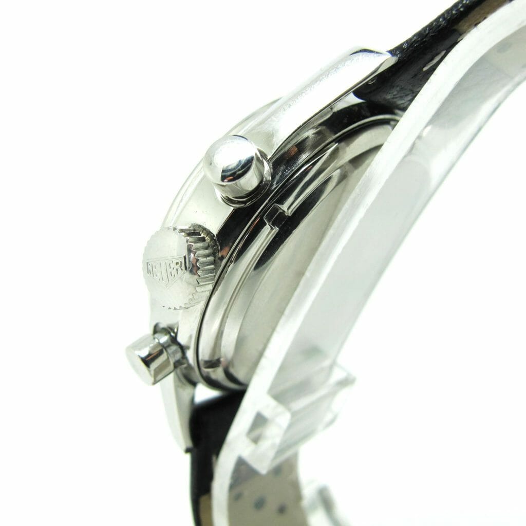 Heuer Carrera NST (black/silver tachymetre). One of the most iconic 1960s Heuer chronographs- this combination has a style reminiscent of the dashboard dials of the era and is very rare. 2nd generation dial in fabulous all original condition and all the lume spots in tact, this version displays a tachymetre on the edge of the dial which is a great racing feature. Powered by the hand wound valjoux 72 movement. The first and finest example we have found in many years.