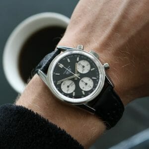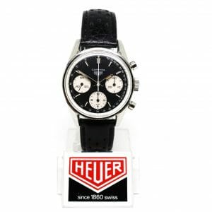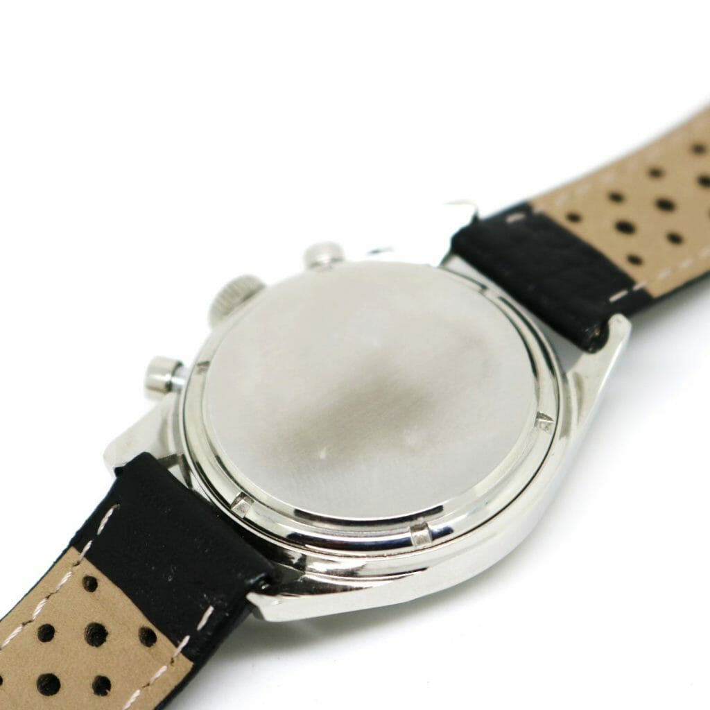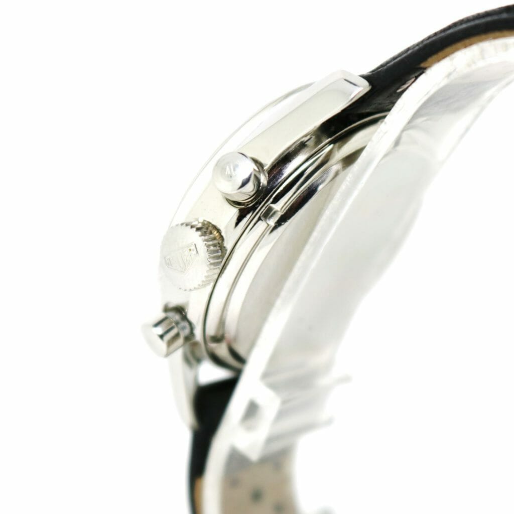 The 2447NST is a highly sought after reference which boasts three silver subdials before a rich black dial- a configuration becoming increasingly rare. This example remains in outstanding condition, with its dial showing no signs of age and stainless steel case remaining largely scratch free. Powered by a valjoux 72 handwound movement, this 2447NST features all lume spots in tact with a great racing feature in the tachymetre ring around the circumference of the dial. This pristine example, fitted on a black leather racing strap, is an excellent opportunity to invest in one of history’s finest chronographs.