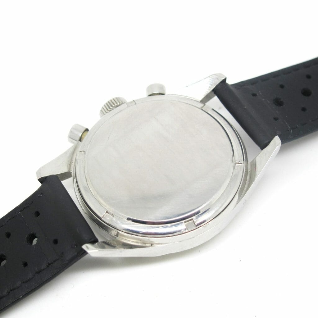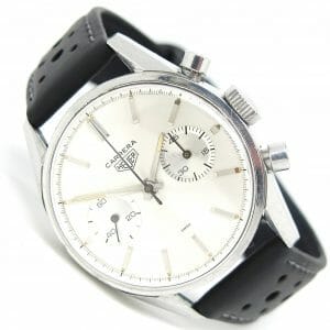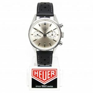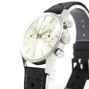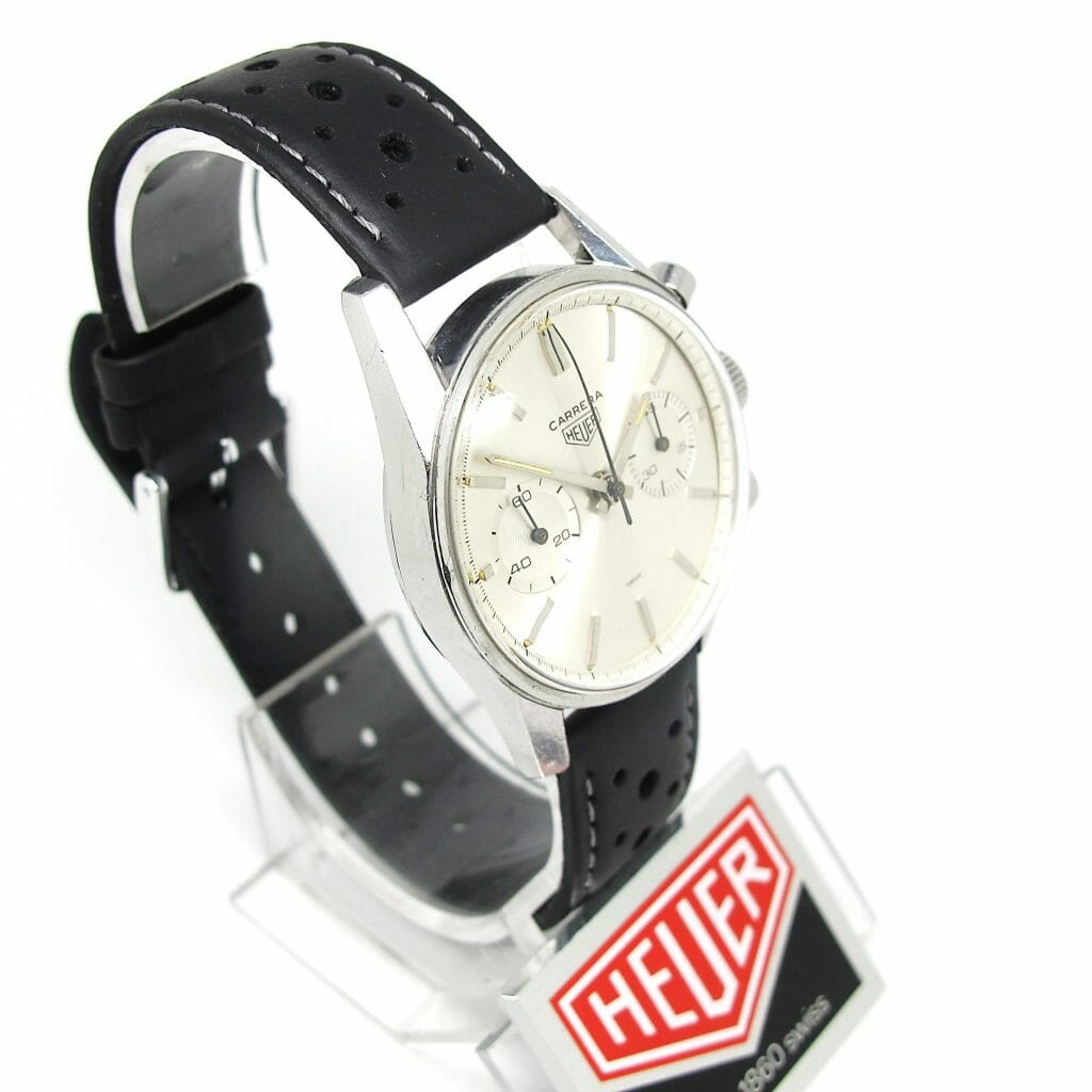 A classic Carrera from the mid 60s. Features a sunburst silver dial with the twin chronograph dials timing up to 45 minutes. The condition is very good, coming from the original owner. It has some light scuffs but is all ready to wear and enjoy. We have fitted one of our black racing straps to this watch but if preferred, another colour may be selected from our straps page. Please let us know your preference.