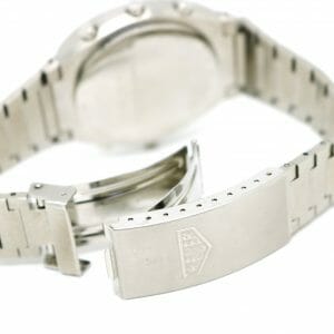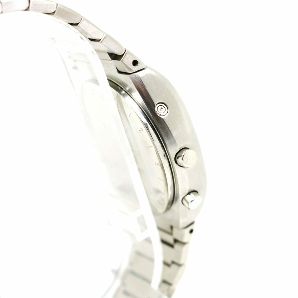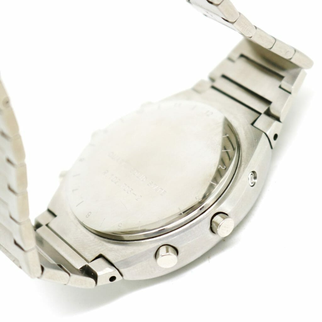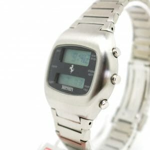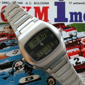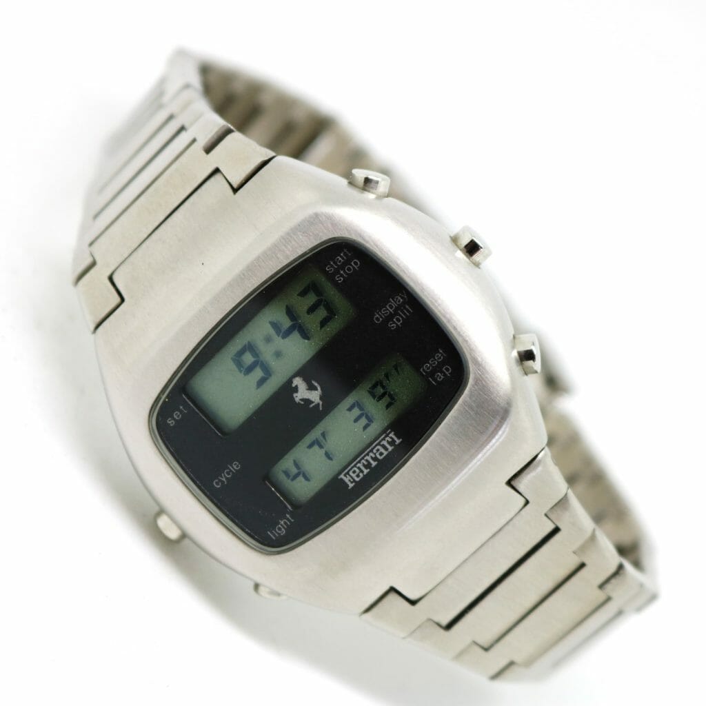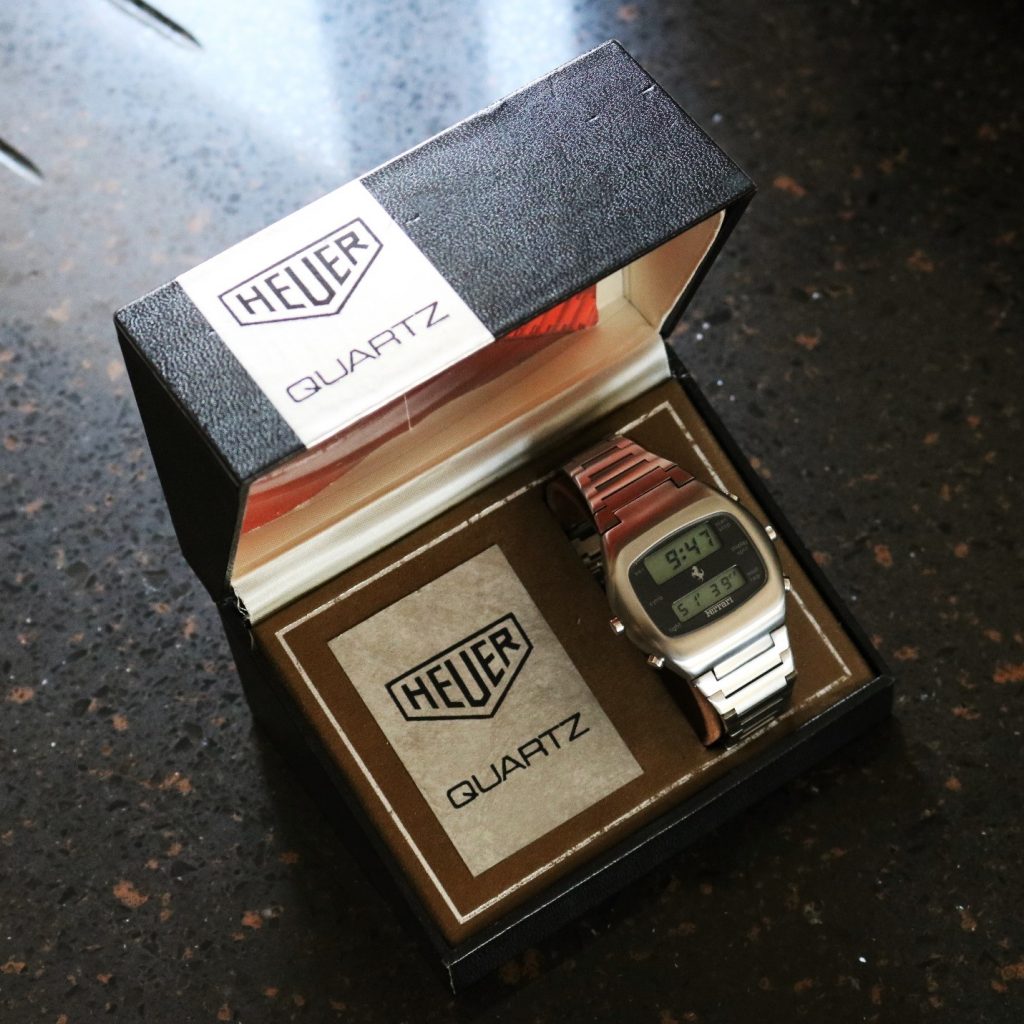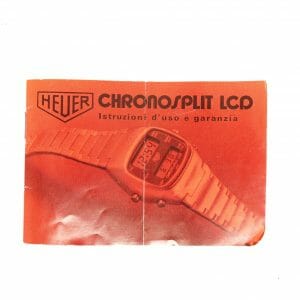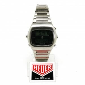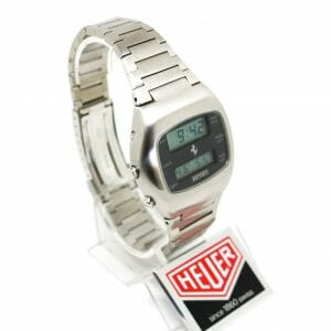 This special edition Ferrari Heuer Chronosplit was an extremely rare find. These watches, produced in a limited number, were commissioned by Enzo Ferrari and were given to his employees and loyal customers. We received this watch from the original owner who worked for Ferrari in Cape Town, South Africa. At the time of their release in 1977, these watches were considered to be one of the most cutting-edge technologies in watchmaking, with the potential to change Heuer’s history from that point. It is therefore a privilege to receive such a esteemed piece adorned with the Ferrari logo, appropriately combining the worlds of racing and watches into a fine, digital package. Adding to this watch’s rarity is its inclusion of original box and papers alongside. Furthermore this Chronosplit has just been serviced and is in fully working order and remains in outstanding condition- one of the best we have seen. This is a very unique and marvellous piece which will stand out prominently in any Heuer or Ferrari collection.