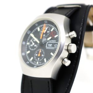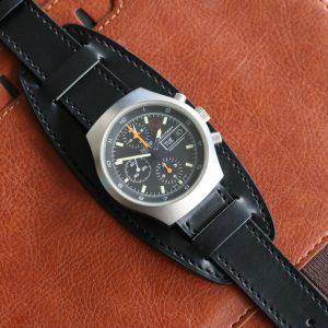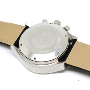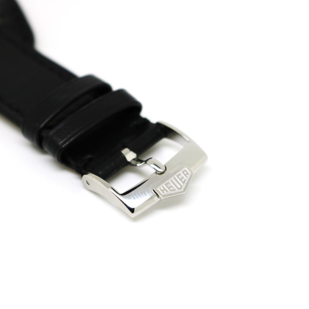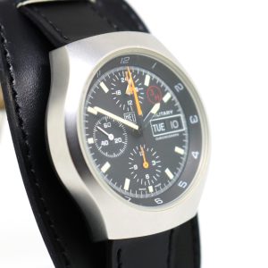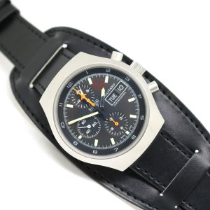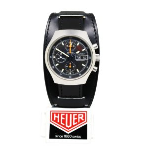 A wonderful mid-1980s military-style Heuer, produced with the ever-reliable Lemania 510 automatic chronograph movement. As with all military watches, clarity is key and therefore this dial is superb. This example is believed to be the prototype of the watch which became the A.M.I Italian air force issued watch. The overall condition is very good, and is presented on a suitably military-style black leather ‘Bund’ strap. A rare and interesting watch, representing the widespanning history of Heuer in the 1980s.