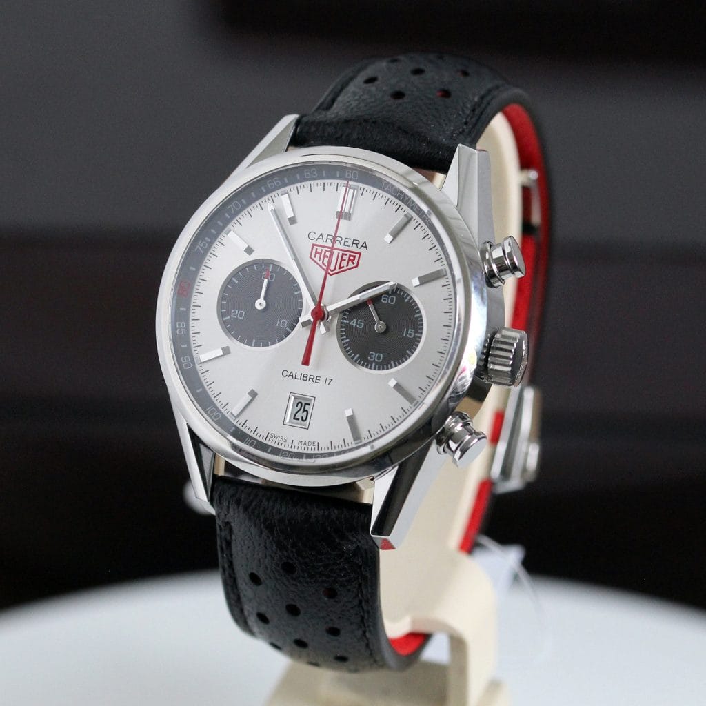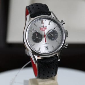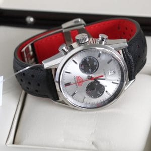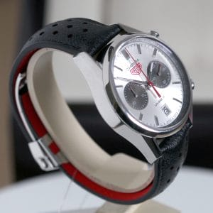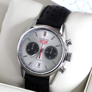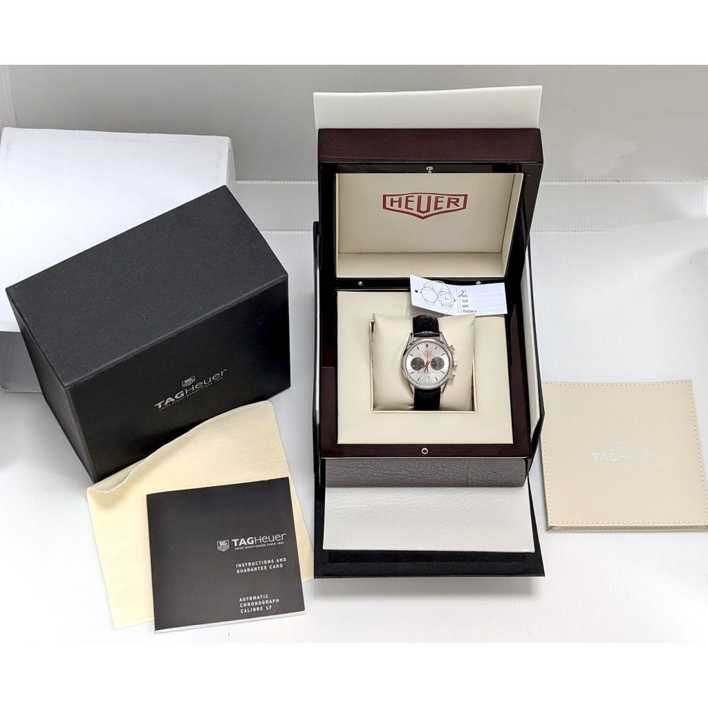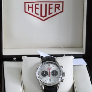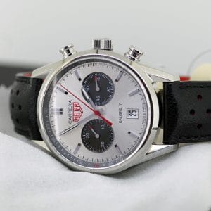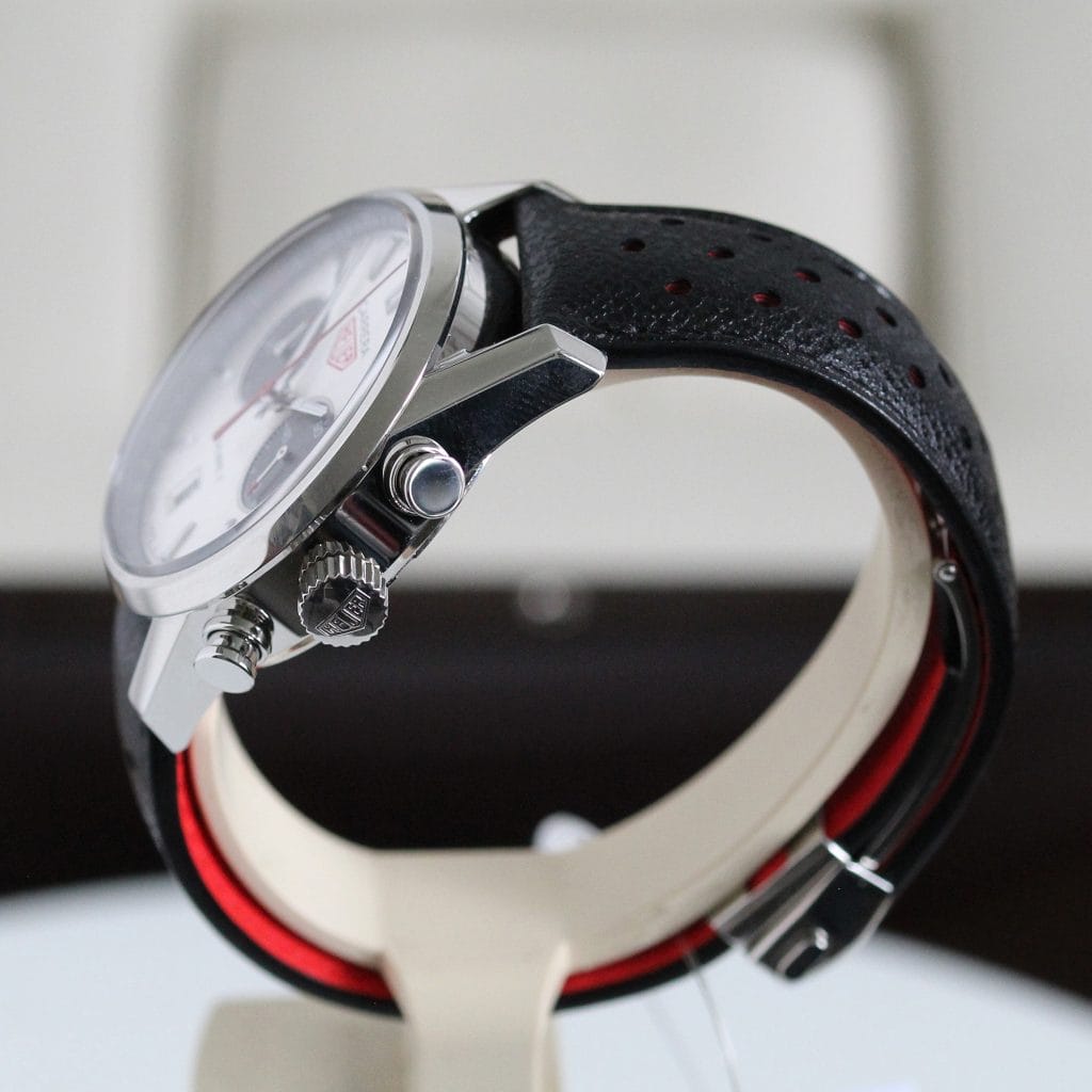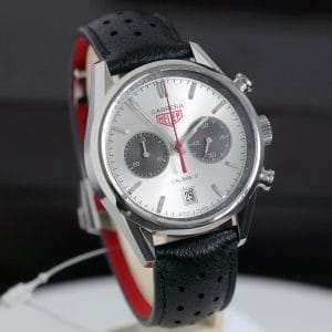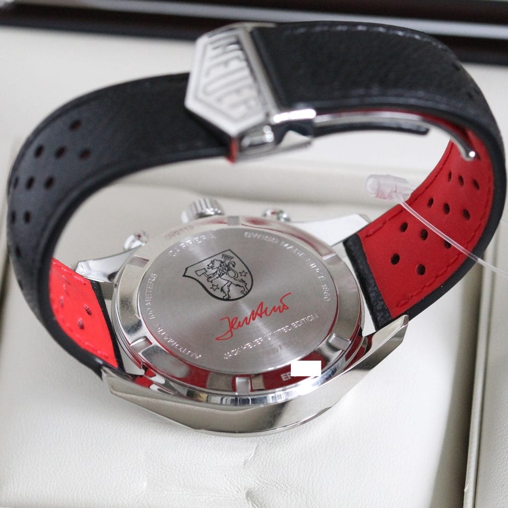 In 2012 Tag Heuer released this superb Carrera to celebrate the 80th anniversary of Jack Heuer. This watch was designed by Jack and reflects perfectly his philosophy of ultimate clarity and ease of reading. A rare version of the CAL 1884 it has a twin dial display rather than the usual 3 dial gives a very vintage look. Limited to just 3000 pieces the remarkable attention to detail even includes the racing strap with rich red lining and a folding buckle. This example is in exceptional condition and has the presentation box and papers. Very collectable and a fabulous every day wearer.