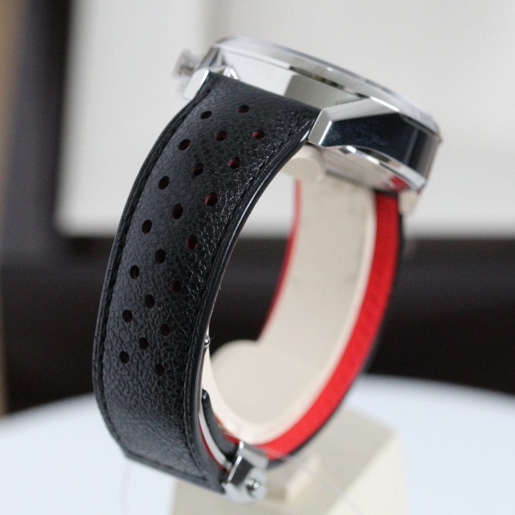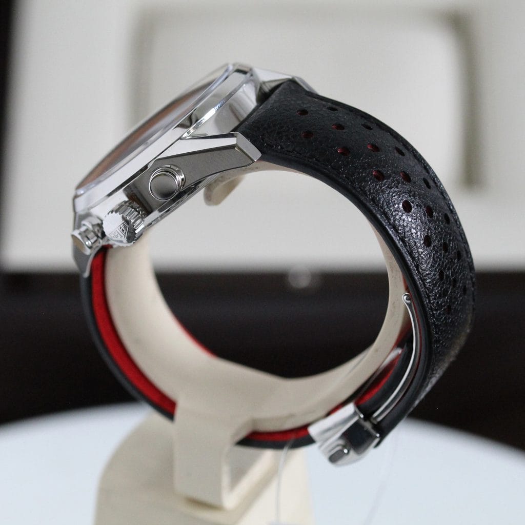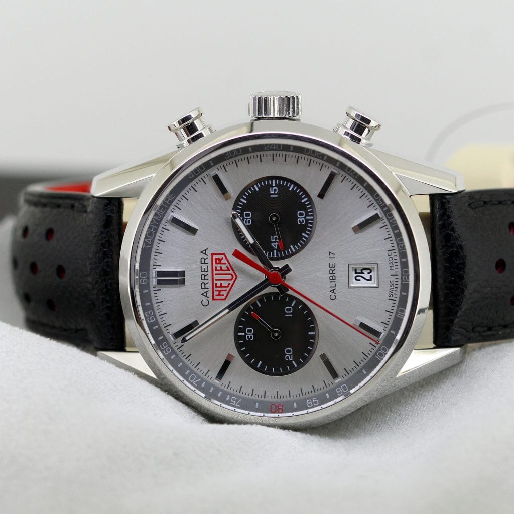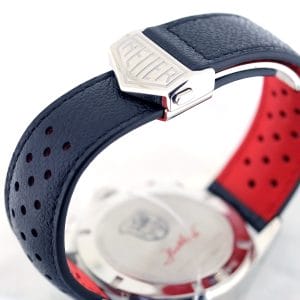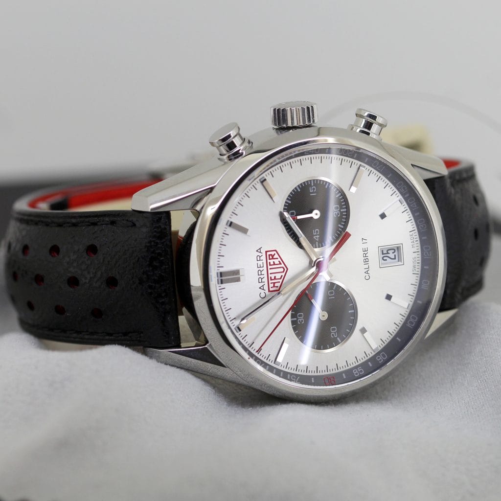 In 2012 Tag Heuer released this superb Carrera to celebrate the 80th anniversary of Jack Heuer. This watch was designed by Jack and reflects perfectly his philosophy of ultimate clarity and ease of reading. A rare version of the CAL 1884 it has a twin dial display rather than the usual 3 dial gives a very vintage look. Limited to just 3000 pieces the remarkable attention to detail even includes the racing strap with rich red lining and a folding buckle. This example is in exceptional condition and has the presentation box and papers. Very collectable and a fabulous every day wearer.