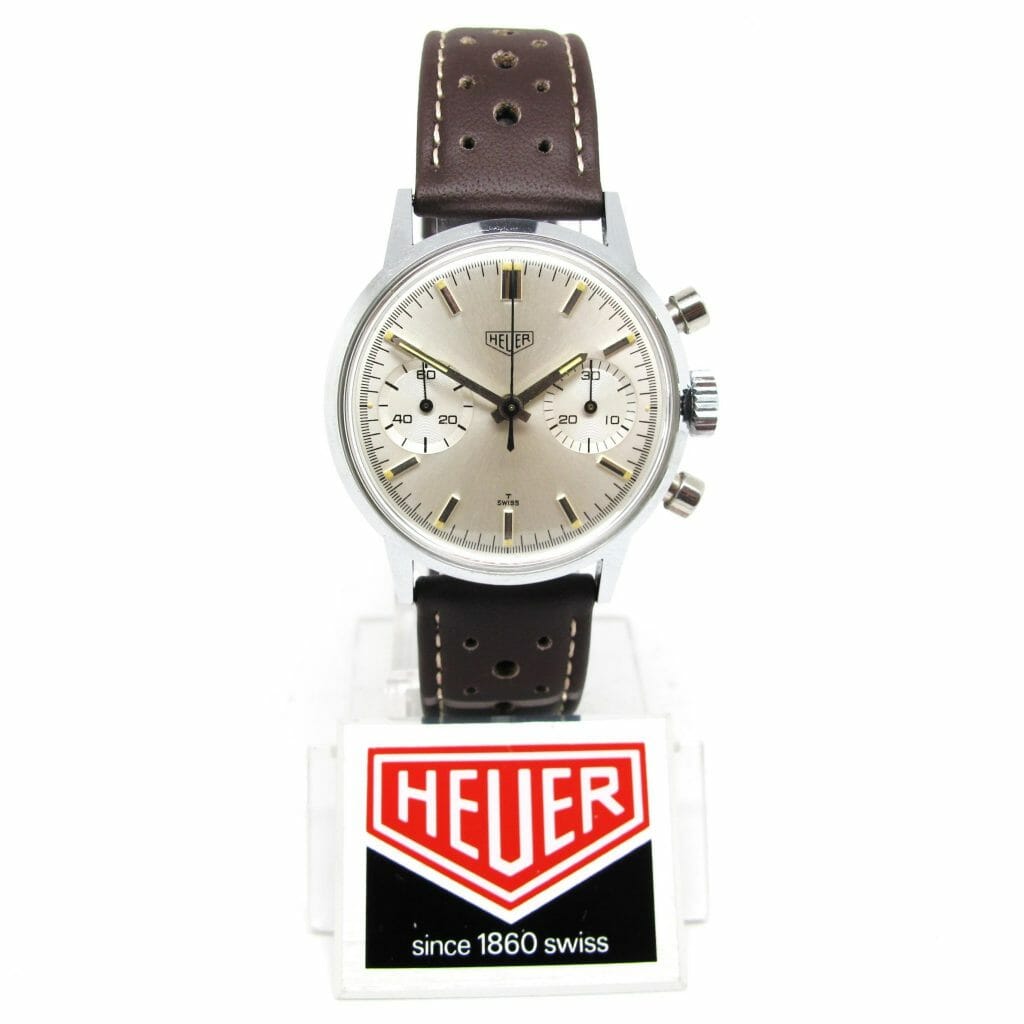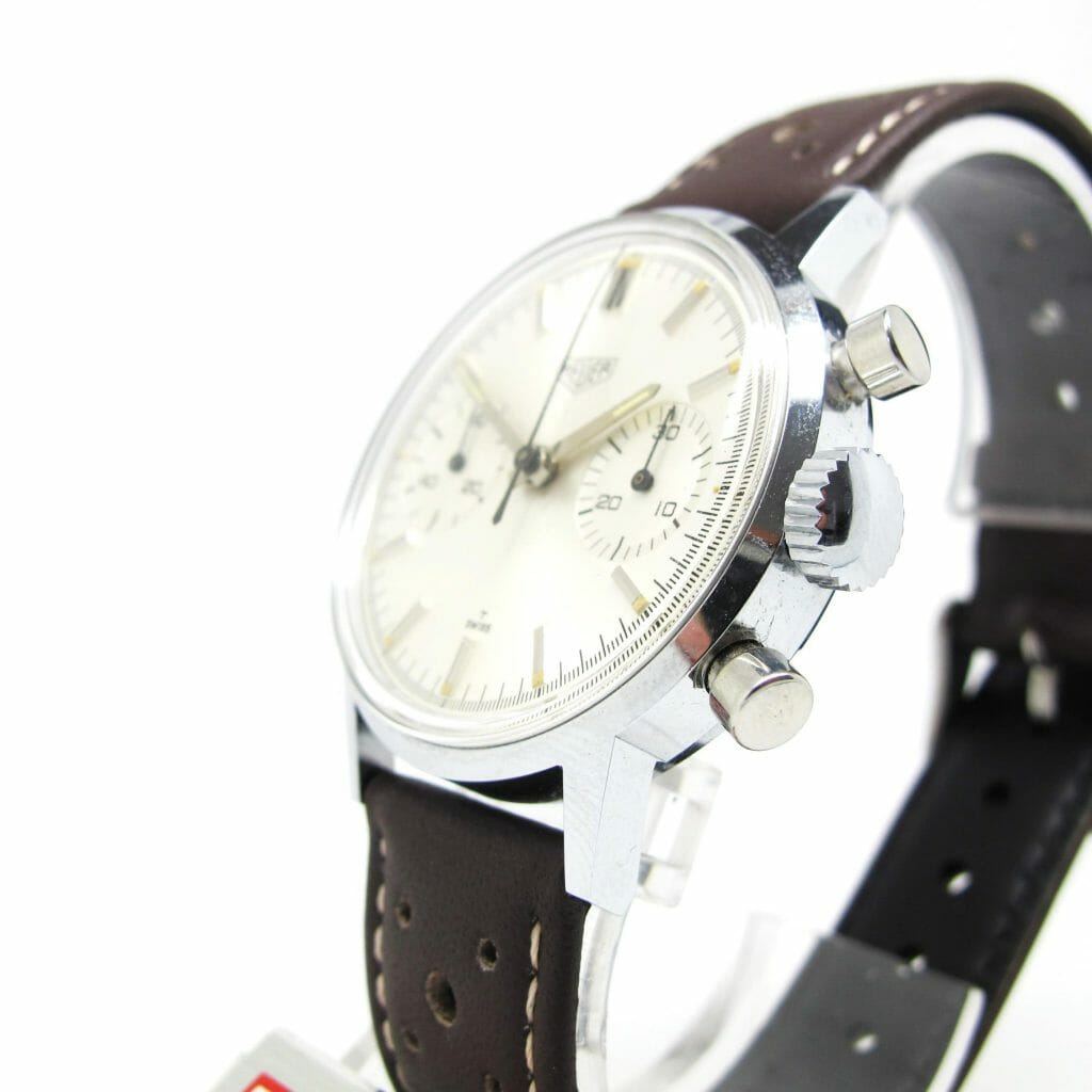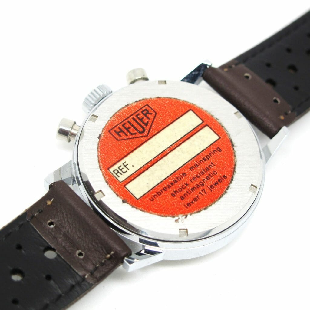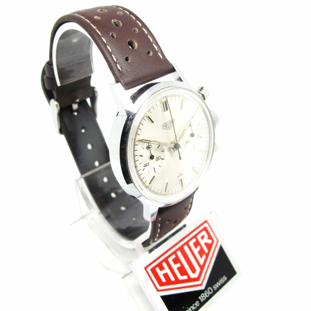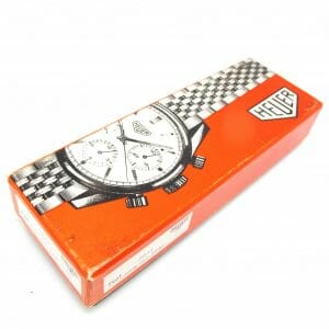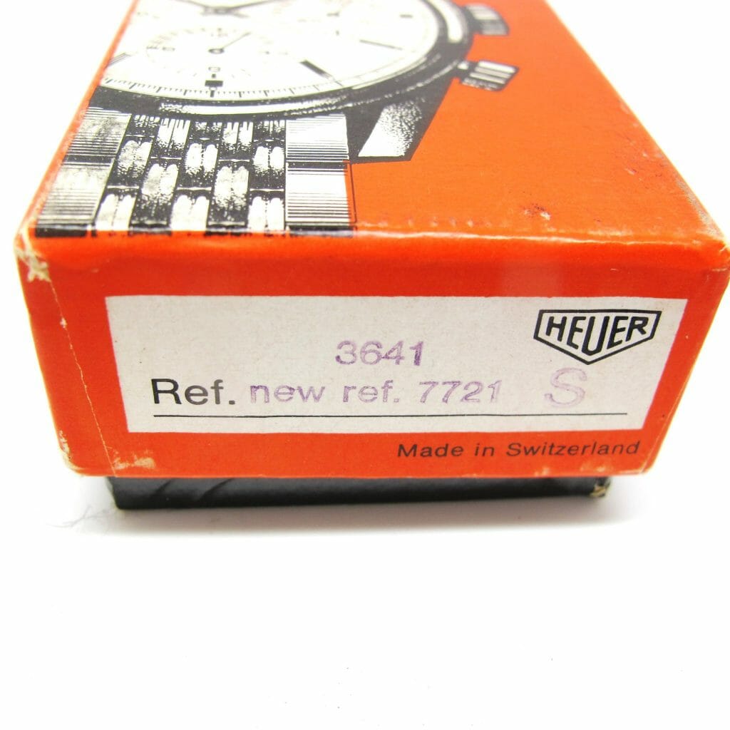 An amazing find! This chrome case/steel back so called “economy” model has been stored in it’s box (with no strap) since the late sixties. Interesting that the box shows ref 3641 new ref 7721 and the watch has 7721 on the case. The box also has 60.50 hand written on the side which was the price $60.50 in the 1967 catalogue. Perhaps the finest example of this model ever offered? Case even has the sticker on the back,, we fitted the watch with one of our new brown racing straps, other colours are available if preferred. A rare opportunity to buy a perfect vintage Heuer.