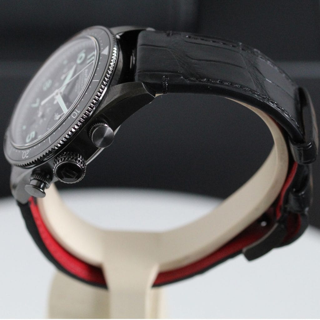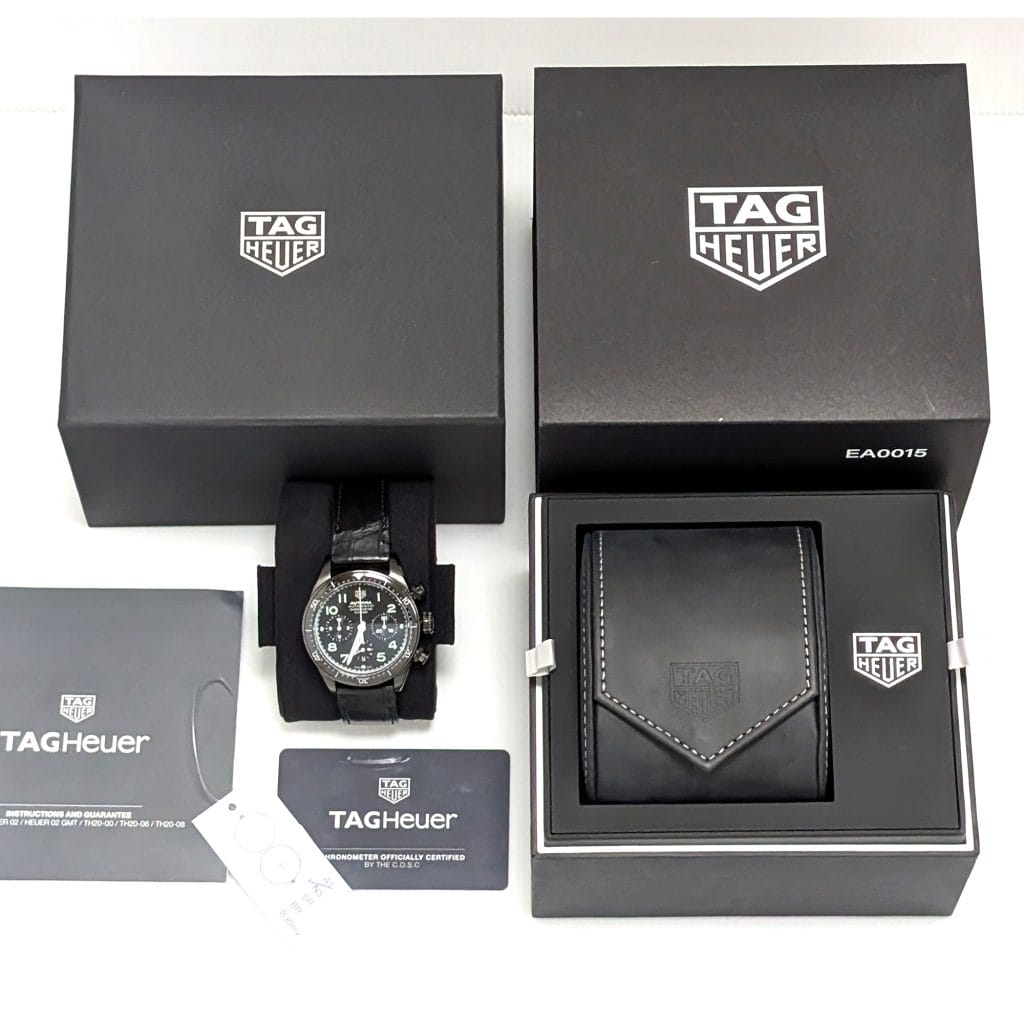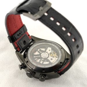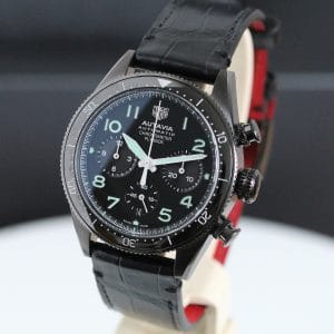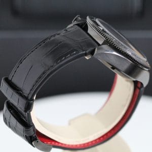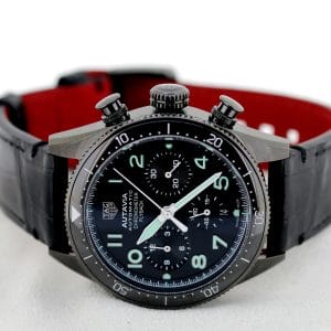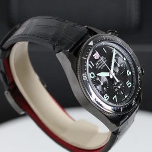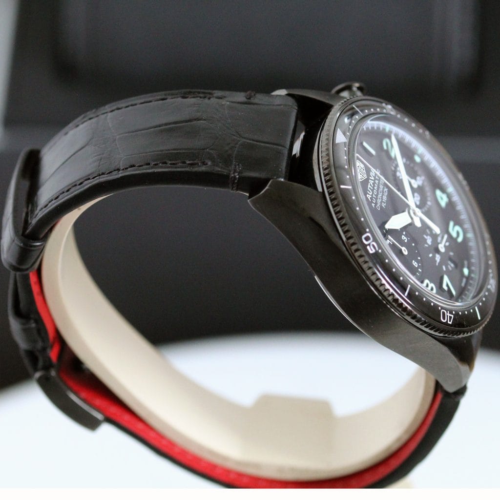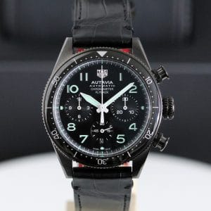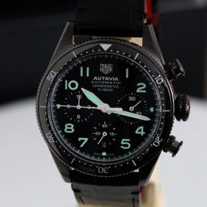 A very fine quality and interesting version of the Autavia, a watch has gone a little “under the radar”, it features the added complication of a flyback on the chronograph which certainly reflects the Aviation part of the name . The movement is the 02 Cal with COSC chronometer certification. Black DLC case which is both polished and brushed, screw down crown giving water resistance to 100 meters. The strap has the brilliant easy to use release system making it easy to change to look to your individual taste. Super watch easy to wear at 41mm.