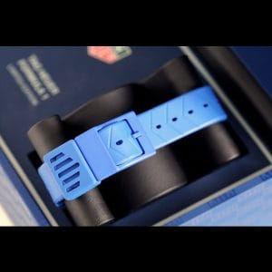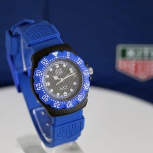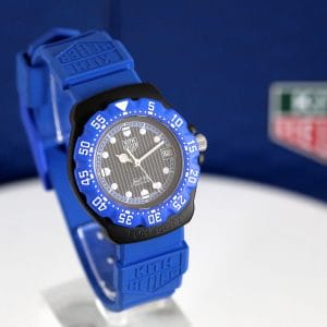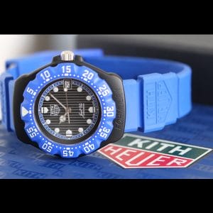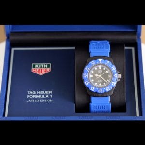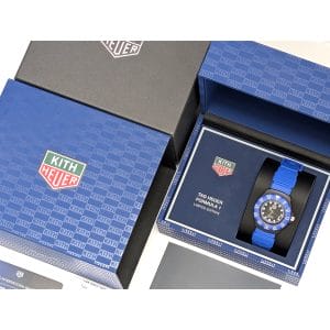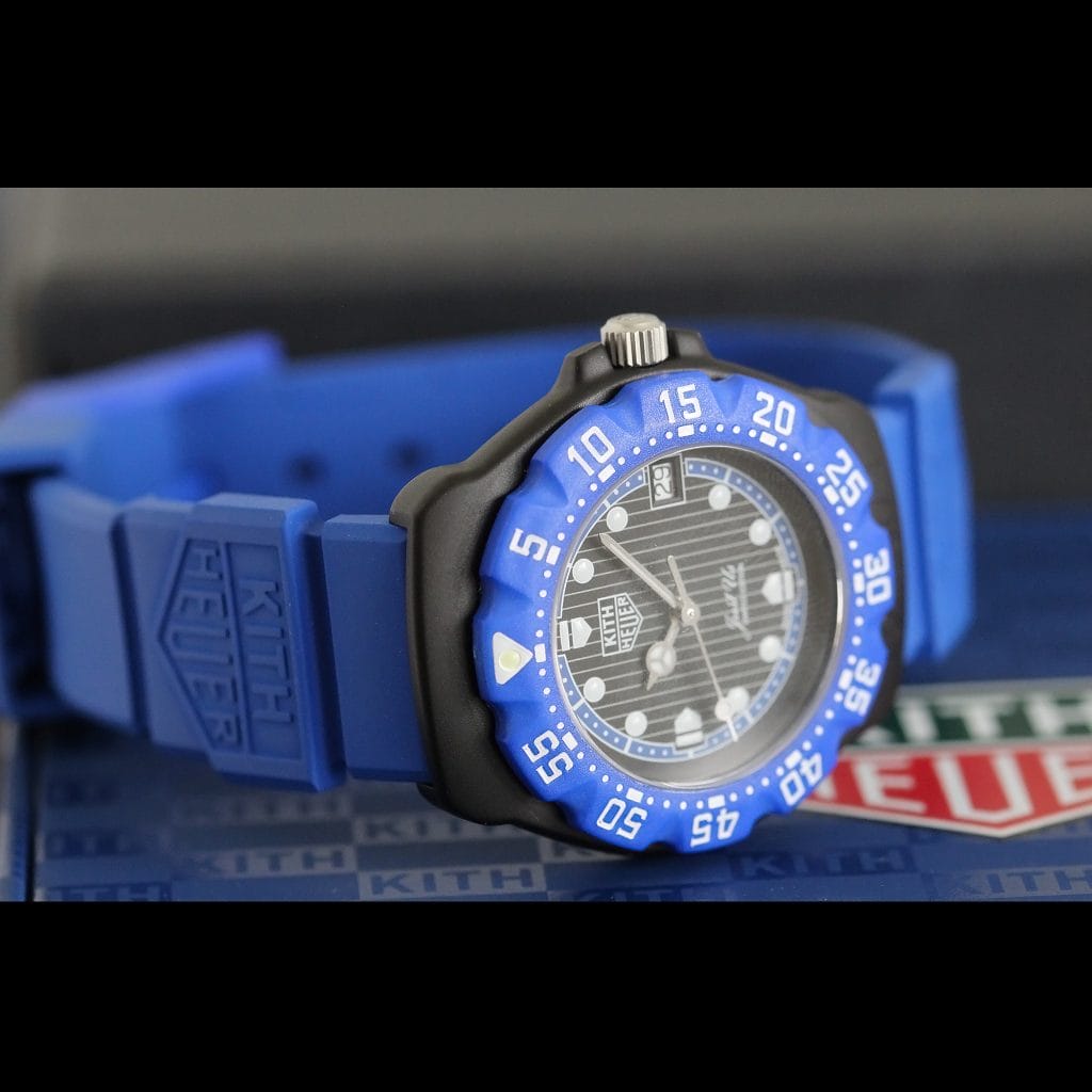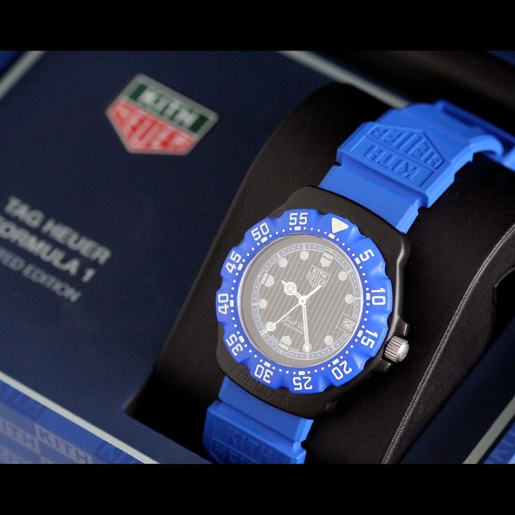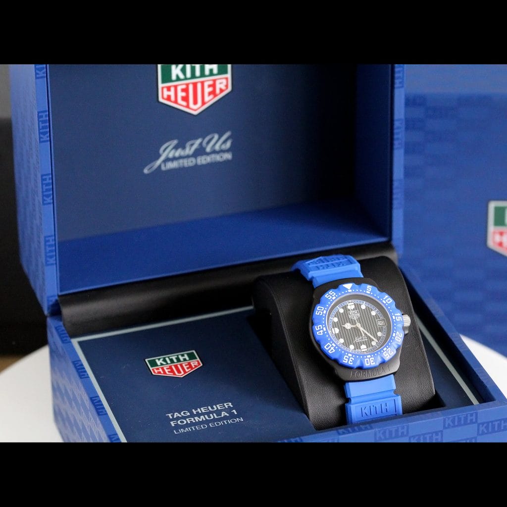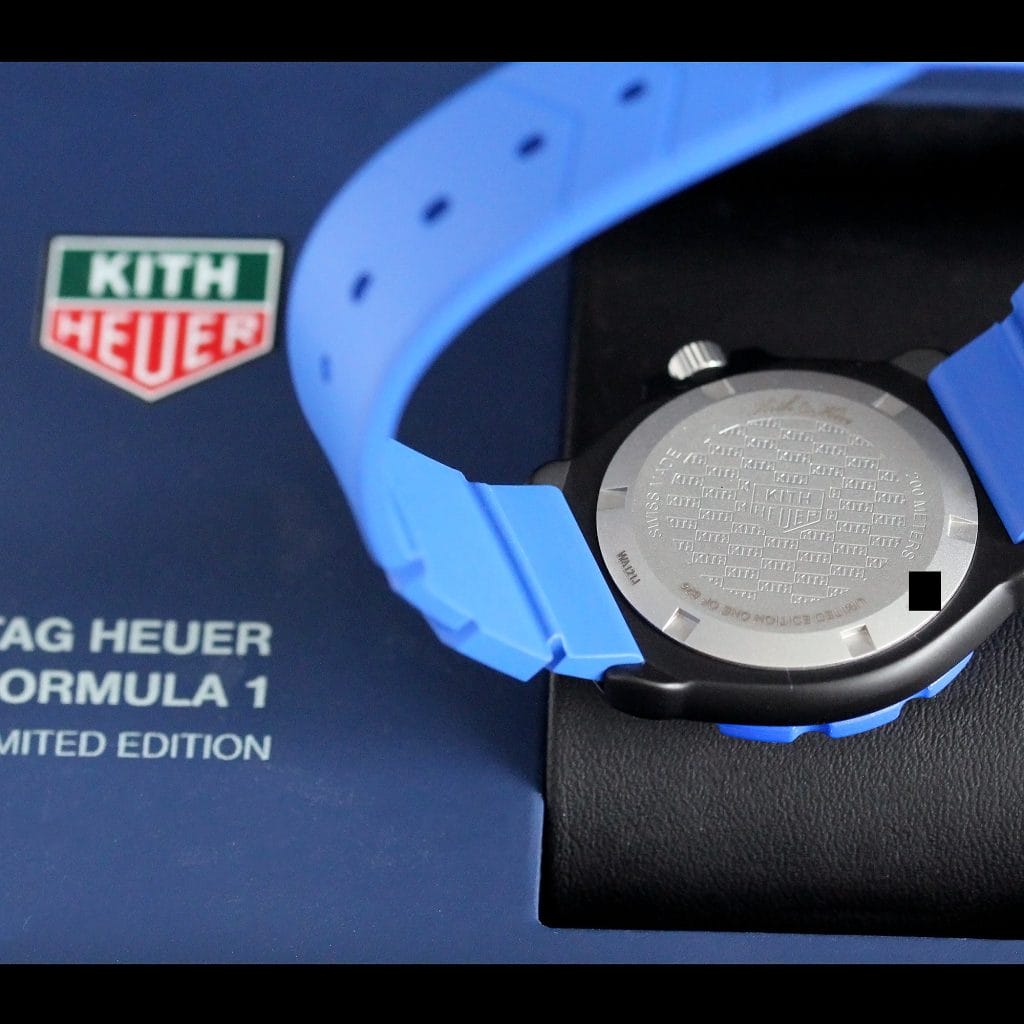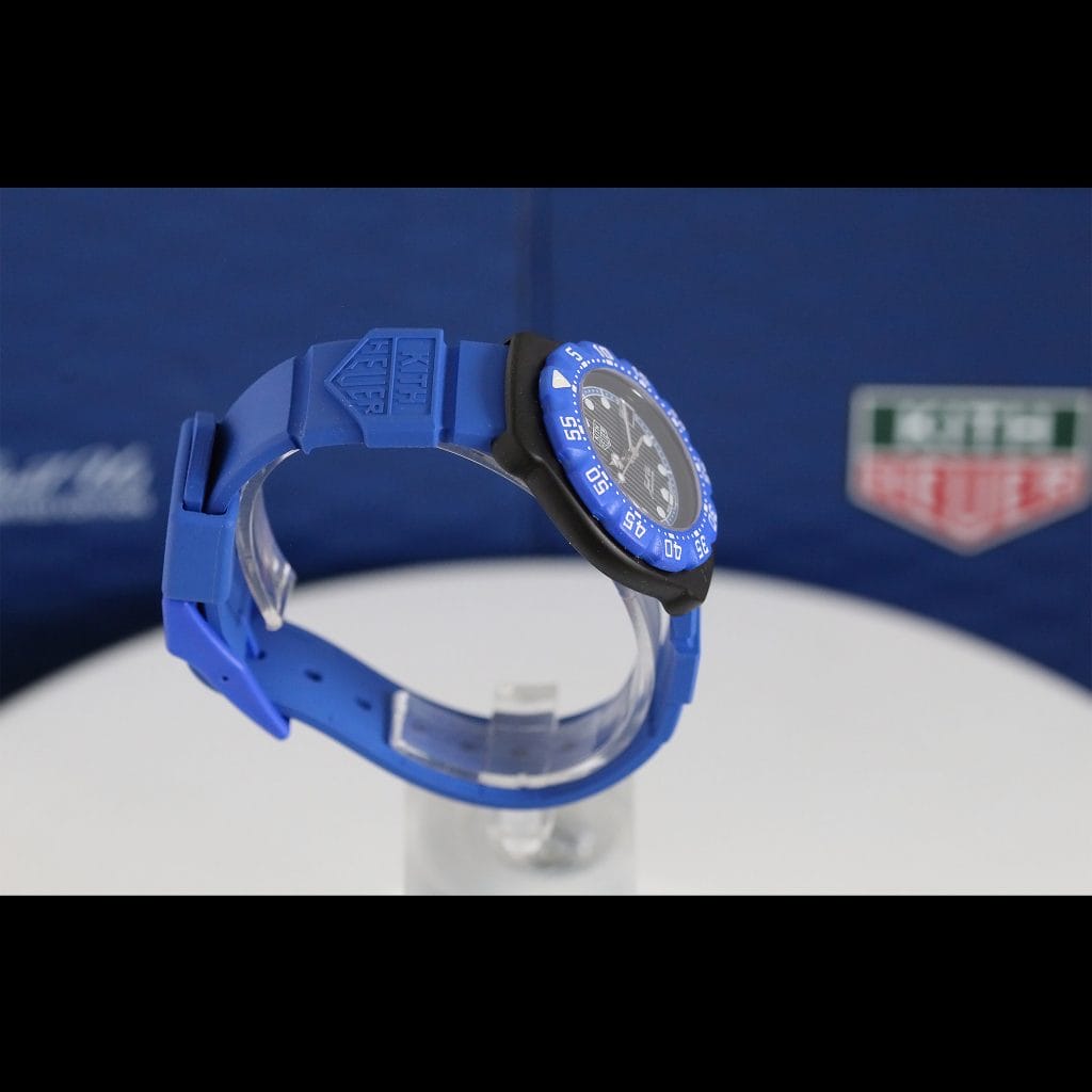 The TAG Heuer Formula 1 Kith Watch WTL4230 features a blue rubber strap, black dial, and a quartz movement. This limited edition wristwatch is designed in a round shape with a sporty style, making it suitable for both men and women. The watch comes with original box and papers, as well as a manual, from the year 2024, manufactured in Switzerland. Perfect for those who appreciate quality and style in their accessories.