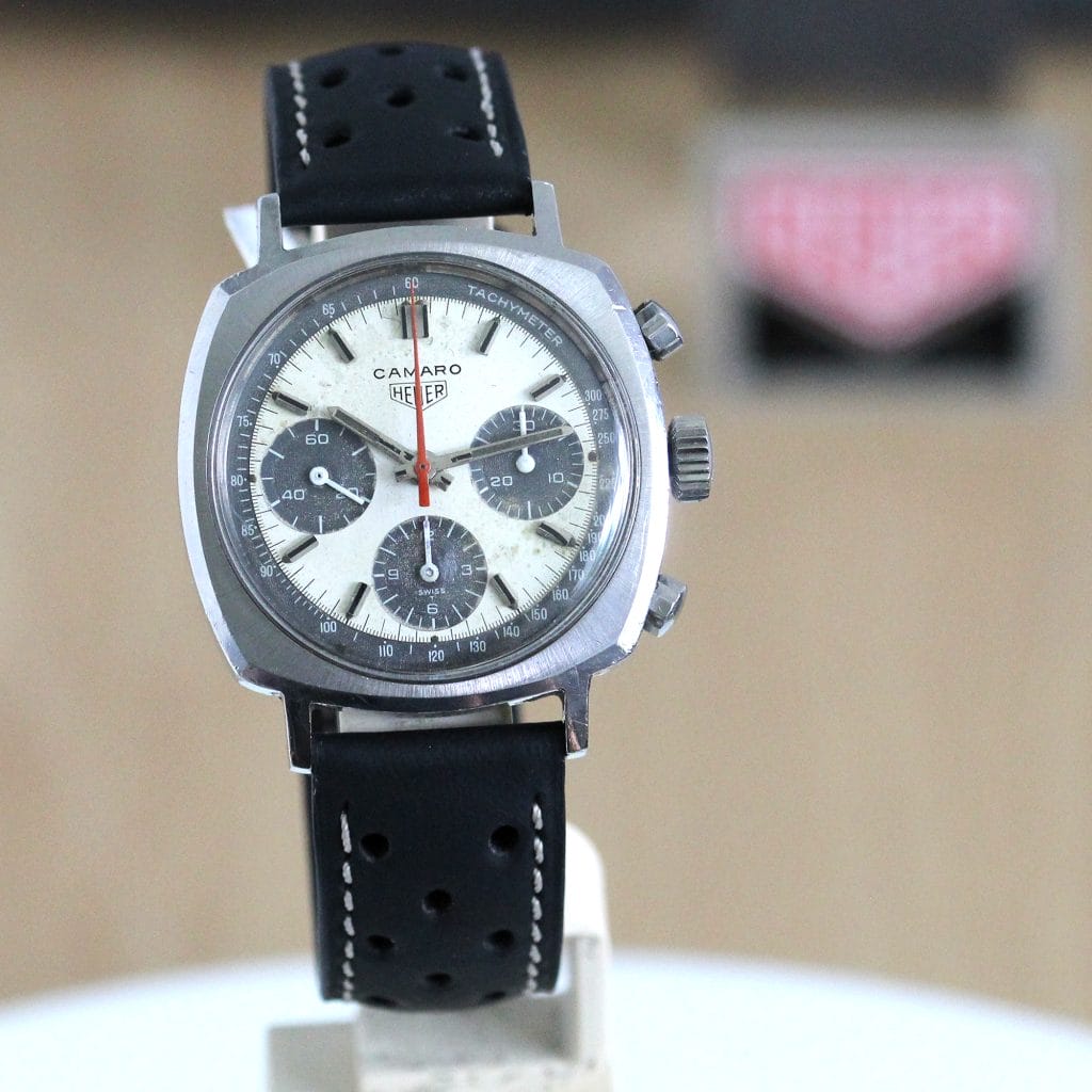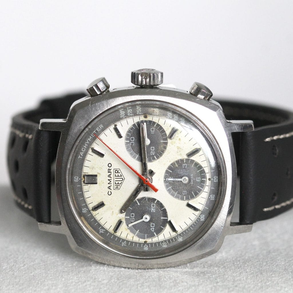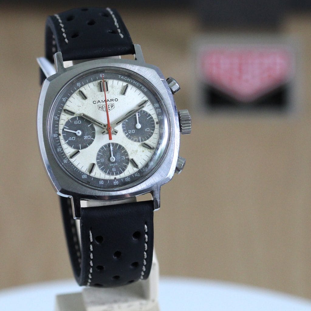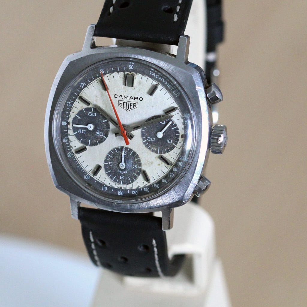 In the shadow of such giants as the Monaco, Carrera and Autavia, the Heuer Camaro’s innovative spirit remains largely overlooked. However as prices for Heuer’s famed trio continue to soar, the Camaro is witnessing a quiet renaissance as the brand’s best value in vintage. Produced in the late ‘60s golden era of legendary sports watches, the early three register Camaro shares its Valjoux 72 movement with the likes of Rolex’s Daytona and the pre-806 Breitling Navitimer. For the serious collector, the Camaro checks all boxes by merit of its specifications alone. Yet for the modern enthusiast, this watch offers a contemporary flare that many vintage pieces do not. Criticisms of the Carrera arise through its modest 36mm diameter- while only 1mm larger, the Camaro’s square shape commands a greater, fleshed out presence on the wrist. Sharing similar dials, hands and movements, the Camaro had all the simplicity of its predecessor, the Carrera. However the Camaro’s major difference lies in its cushion-shaped case, boasting a polished grind on its concave sides to offer a grittier modern character. Much as the Camaro automobile was Chevrolet’s response to the wildly popular Ford Mustang, the Heuer Camaro offered a dynamic new spin on its elder sister. However, while the Chevy Camaro’s star would continue to rise, the Camaro wristwatch would be discontinued after only 4 years in 1972, eclipsed by Heuer’s bold new line of automatic chronographs.
