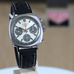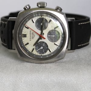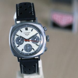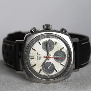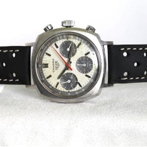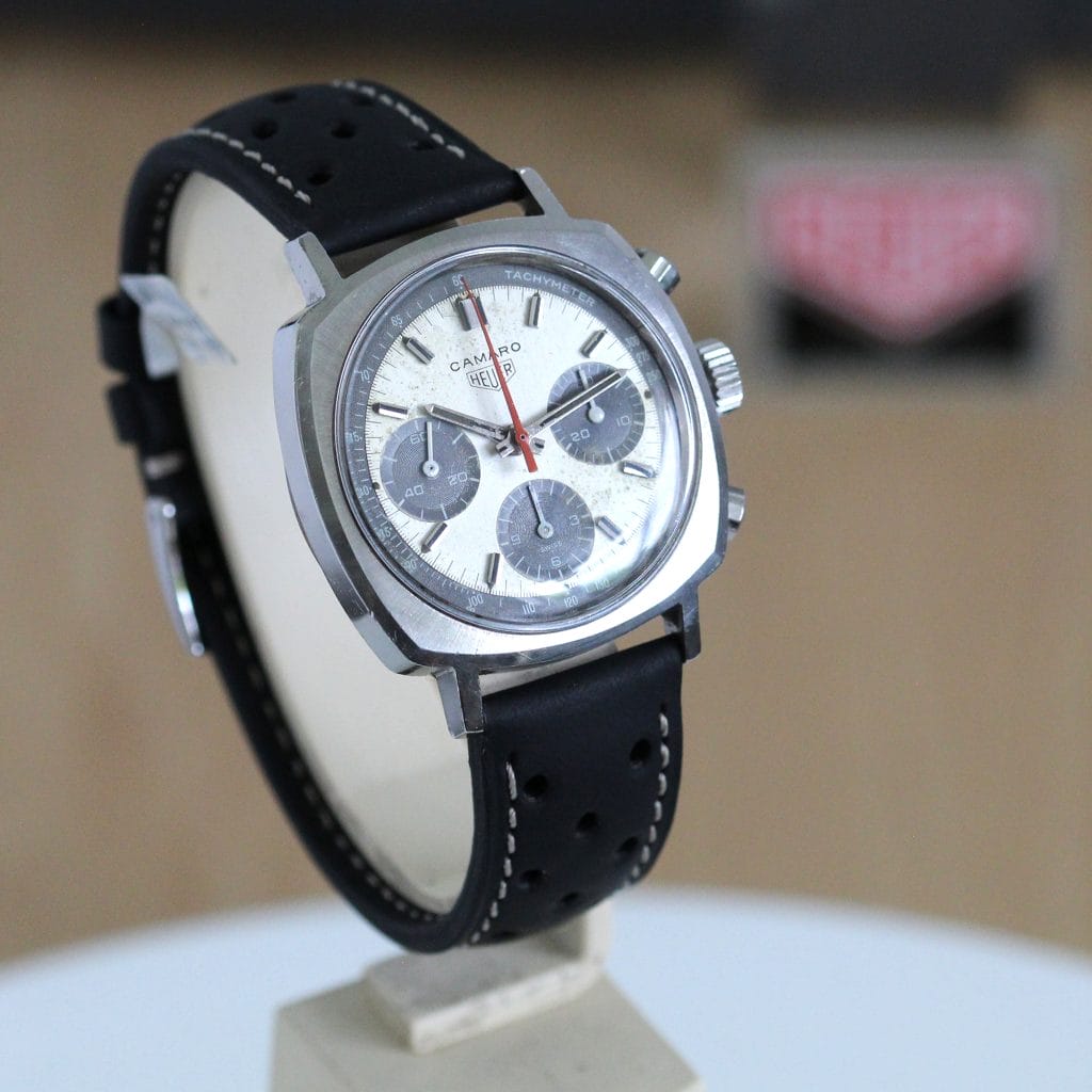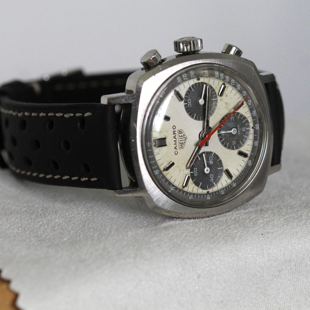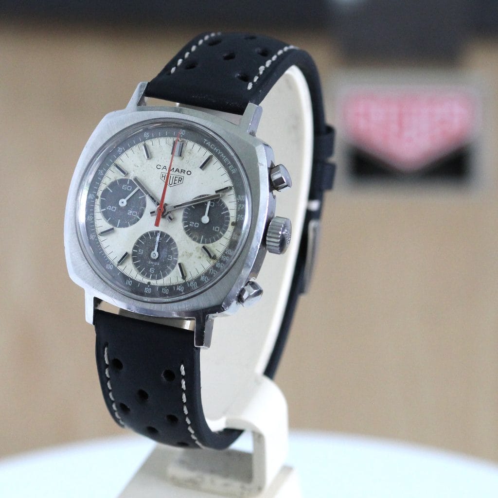 In the shadow of such giants as the Monaco, Carrera and Autavia, the Heuer Camaro’s innovative spirit remains largely overlooked. However as prices for Heuer’s famed trio continue to soar, the Camaro is witnessing a quiet renaissance as the brand’s best value in vintage. Produced in the late ‘60s golden era of legendary sports watches, the early three register Camaro shares its Valjoux 72 movement with the likes of Rolex’s Daytona and the pre-806 Breitling Navitimer. For the serious collector, the Camaro checks all boxes by merit of its specifications alone. Yet for the modern enthusiast, this watch offers a contemporary flare that many vintage pieces do not. Criticisms of the Carrera arise through its modest 36mm diameter- while only 1mm larger, the Camaro’s square shape commands a greater, fleshed out presence on the wrist. Sharing similar dials, hands and movements, the Camaro had all the simplicity of its predecessor, the Carrera. However the Camaro’s major difference lies in its cushion-shaped case, boasting a polished grind on its concave sides to offer a grittier modern character. Much as the Camaro automobile was Chevrolet’s response to the wildly popular Ford Mustang, the Heuer Camaro offered a dynamic new spin on its elder sister. However, while the Chevy Camaro’s star would continue to rise, the Camaro wristwatch would be discontinued after only 4 years in 1972, eclipsed by Heuer’s bold new line of automatic chronographs.