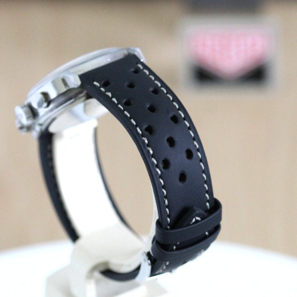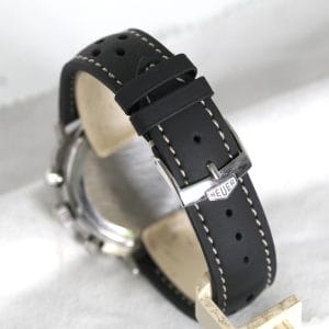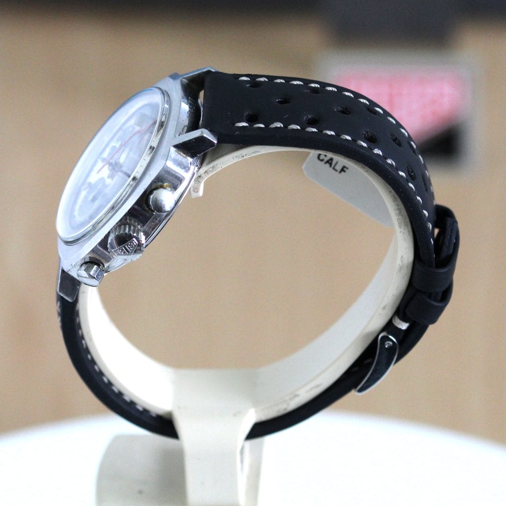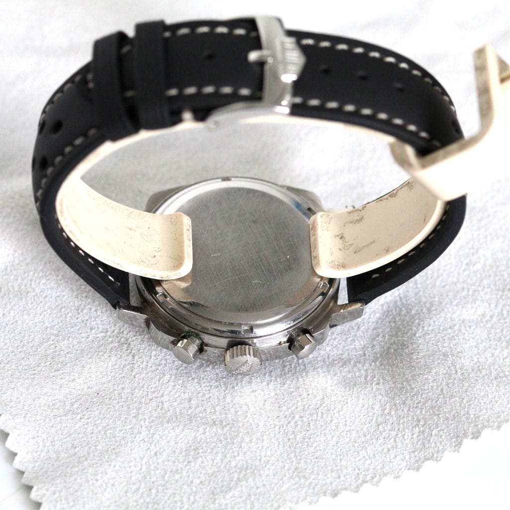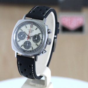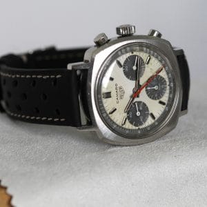 The exotic dials in the third execution of these Camaro’s were more colourful and had more of a ’70’s vibe and this “Panda” certainly stands out. Purchased from the original owner, the watch is showing patina on the dial and light fading to the sub dials, the case is un polished, shows all it’s scars and scratches but is so honest and the sunburst finish is all in tact. Mechanically sound and ready to wear and enjoy.