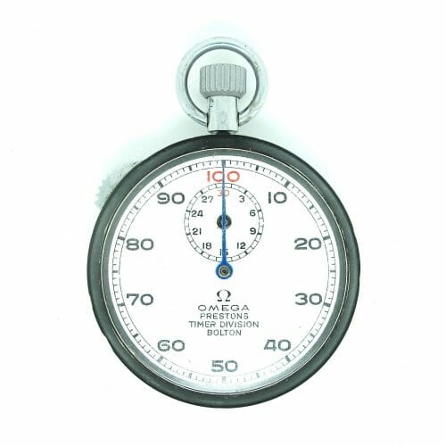 Omega decimal timer for Prestons timer division in Bolton. Slide action start with button re set, black anodized case.